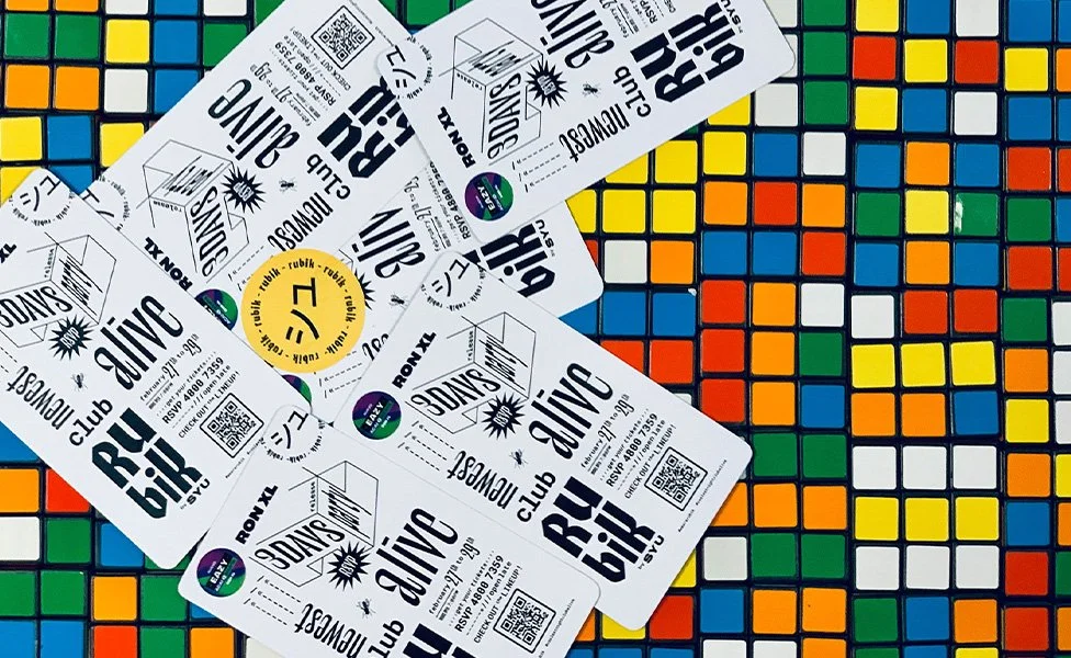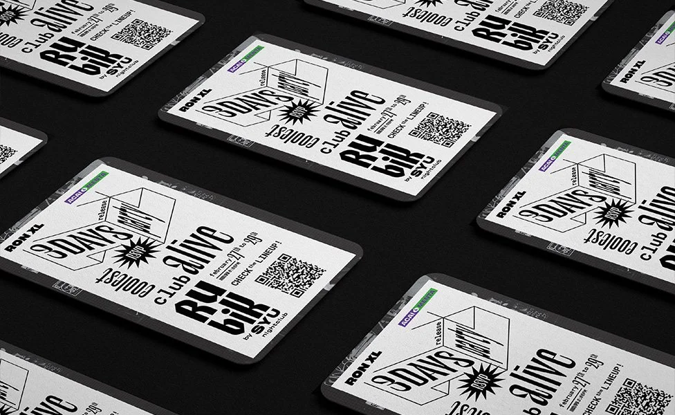 RUBIK bar by SYU Through the three-dimensionality of the famous puzzle, was developed the graphic line for this nightly entertainment club. The color palette corresponds to the main ones of the Rubik's cube, the interior of the space was decorated with PVC cubes illuminated with the same colors. The icon for Rubik comes from the Japanese kanji シュ which is pronounced SIU (allegorical to Sex You Up). It is also related to a happy emoji :)